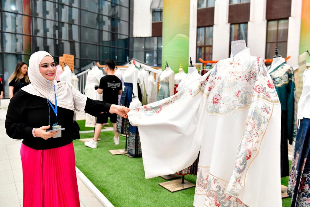A model presents Hanfu on the stage during a Hanfu launch event in Caoxian County of Heze City, east China's Shandong Province, April 10, 2025.(Xinhua/Guo Xulei)Participants of a training course hosted by China Woman's University select Hanfu at a Hanfu base in Caoxian County, east China's Shandong Province, June 19, 2025. (Xinhua/Wang Yiliang)