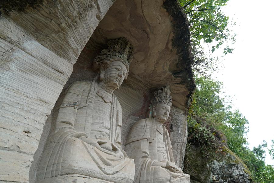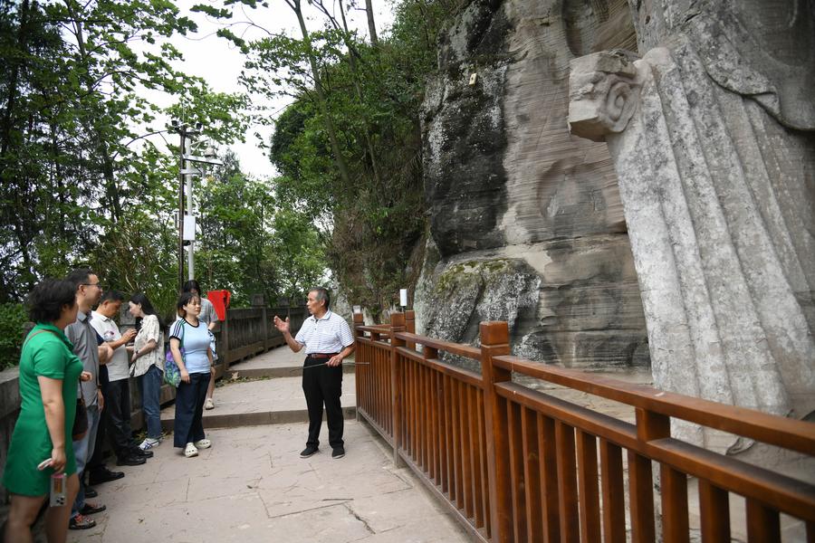 Zeng Xiangyu inspects stone carvings at Mingshan Temple in Shiyang Town of Ziyang City, southwest China's Sichuan Province, June 14, 2025. (Xinhua/Xu Bingjie)An aerial drone photo shows a view of Mingshan Temple (front) atop Hutou Mountain in Shiyang Town of Ziyang City, southwest China's Sichuan Province, June 14, 2025. (Xinhua/Xu Bingjie)This photo shows stone carvings at Mingshan Temple in Shiyang Town of Ziyang City, southwest China's Sichuan Province, June 14, 2025. (Xinhua/Xu Bingjie)