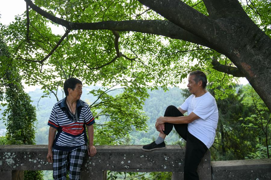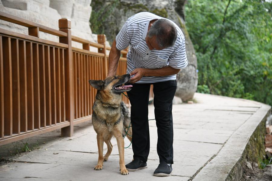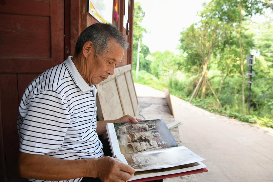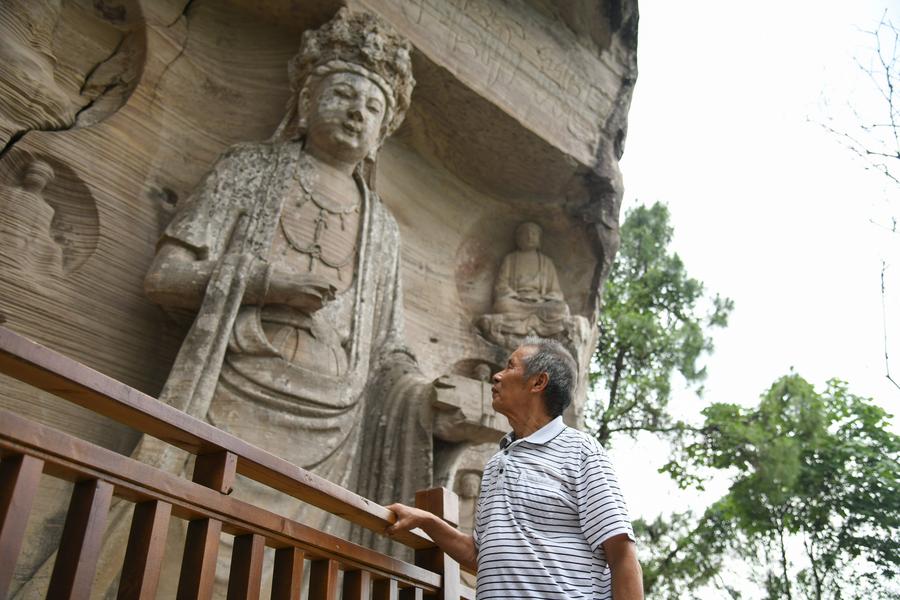 ZIYANG, July 5 (Xinhua) -- On top of Hutou Mountain in Shiyang Town of Ziyang City, southwest China's Sichuan Province, a 76-year-old man named Zeng Xiangyu is a familiar sight to locals. Accompanied by his dog, he patrols the circular path around Mingshan Temple, meticulously inspecting each stone carving.