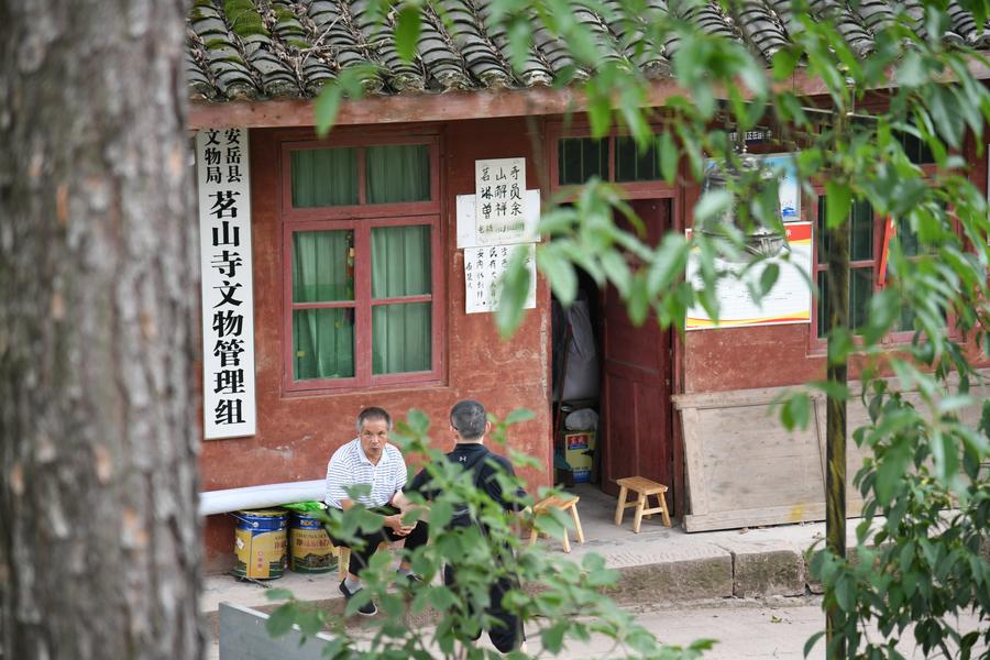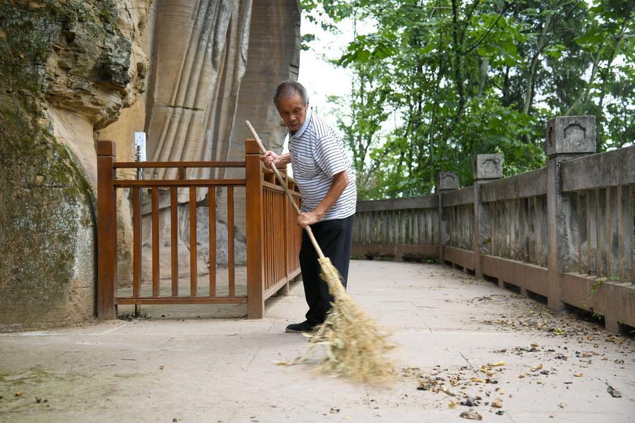 Zeng Xiangyu cleans the fallen leaves at Mingshan Temple in Shiyang Town of Ziyang City, southwest China's Sichuan Province, June 14, 2025. (Xinhua/Xu Bingjie)Zeng Xiangyu wipes off the sweat after inspecting stone carvings at Mingshan Temple in Shiyang Town of Ziyang City, southwest China's Sichuan Province, June 14, 2025. (Xinhua/Xu Bingjie)Zeng Xiangyu talks with a tourist outside his office next to Mingshan Temple in Shiyang Town of Ziyang City, southwest China's Sichuan Province, June 14, 2025. (Xinhua/Xu Bingjie)Zeng Xiangyu (1st R) introduces stone carvings to tourists at Mingshan Temple in Shiyang Town of Ziyang City, southwest China's Sichuan Province, June 14, 2025. (Xinhua/Xu Bingjie)Zeng Xiangyu talks with his wife near Mingshan Temple in Shiyang Town of Ziyang City, southwest China's Sichuan Province, June 14, 2025. (Xinhua/Xu Bingjie)Zeng Xiangyu views a photo album about stone carvings at Mingshan Temple in Shiyang Town of Ziyang City, southwest China's Sichuan Province, June 14, 2025. (Xinhua/Xu Bingjie)Zeng Xiangyu interacts with his dog while inspecting stone carvings at Mingshan Temple in Shiyang Town of Ziyang City, southwest China's Sichuan Province, June 14, 2025. (Xinhua/Xu Bingjie)■