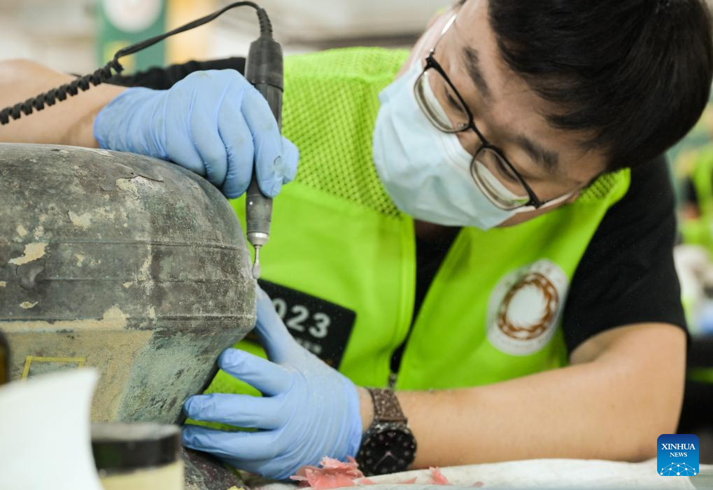 A contestant competes in metal relic restoration during the 2nd National Cultural Heritage Vocational Skills Competition in Luzhou City, southwest China's Sichuan Province, July 5, 2025. Starting from July 3, the four-day event attracted nearly 300 contestants competing in six categories. (Xinhua/Li He)