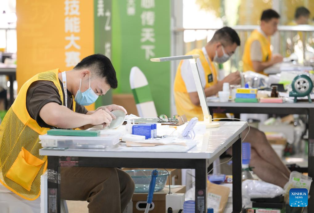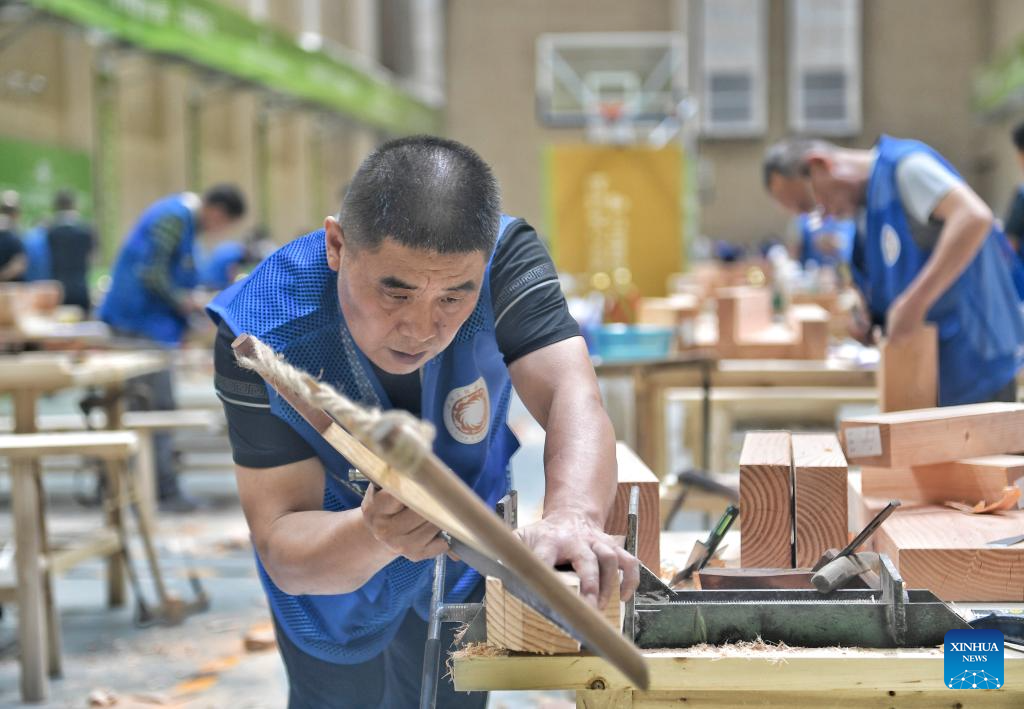 Contestants compete in woodwork relic restoration during the 2nd National Cultural Heritage Vocational Skills Competition in Luzhou City, southwest China's Sichuan Province, July 4, 2025. Starting from July 3, the four-day event attracted nearly 300 contestants competing in six categories. (Xinhua/Li He)