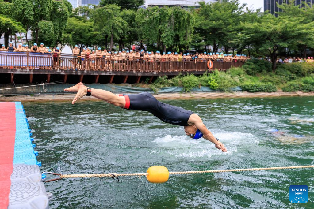 A participant takes part in the 2025 Lotte Aquathlon competition including Lake Swim and Sky Run, in Seoul, South Korea, July 6, 2025. The competition attracted more than 800 participants. (Photo by Park Jintaek/Xinhua)
