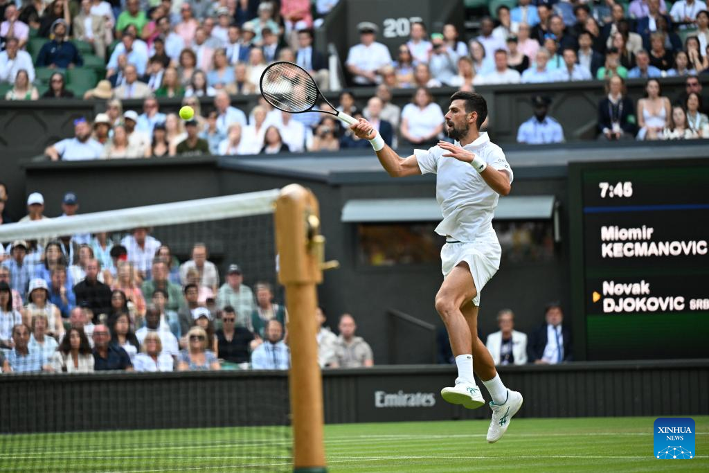 LONDON, July 5 (Xinhua) -- Seven-time champion Novak Djokovic joined men's top seed Jannik Sinner to reach the fourth round at Wimbledon with a straight-sets win over Miomir Kecmanovic on Saturday.