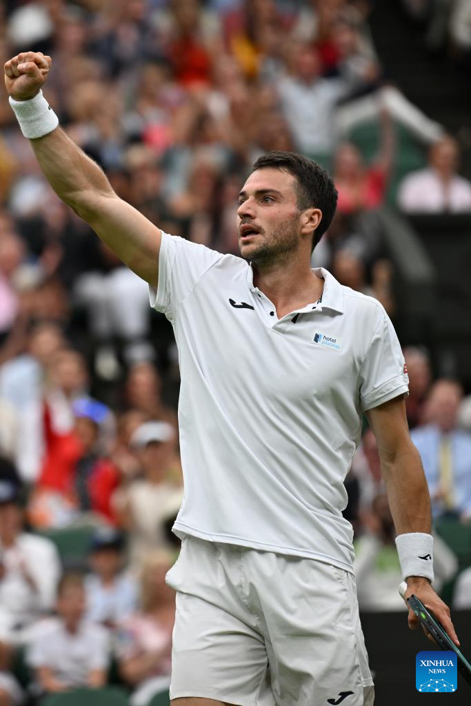 Pedro Martinez reacts during the men's singles third round match between Jannik Sinner of Italy and Pedro Martinez of Spain at the Wimbledon Tennis Championships in London, Britain, July 5, 2025. (Xinhua/Zhao Dingzhe)