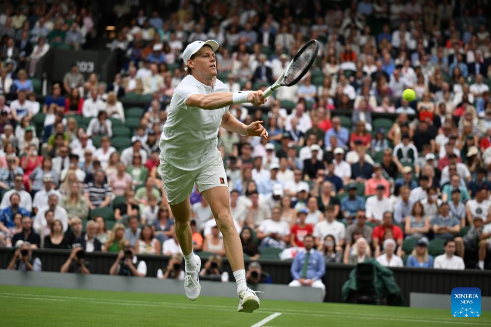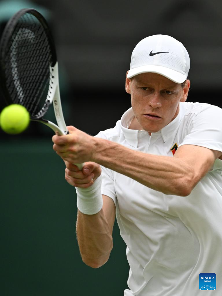 Jannik Sinner hits a return during the men's singles third round match between Jannik Sinner of Italy and Pedro Martinez of Spain at the Wimbledon Tennis Championships in London, Britain, July 5, 2025. (Xinhua/Zhao Dingzhe)