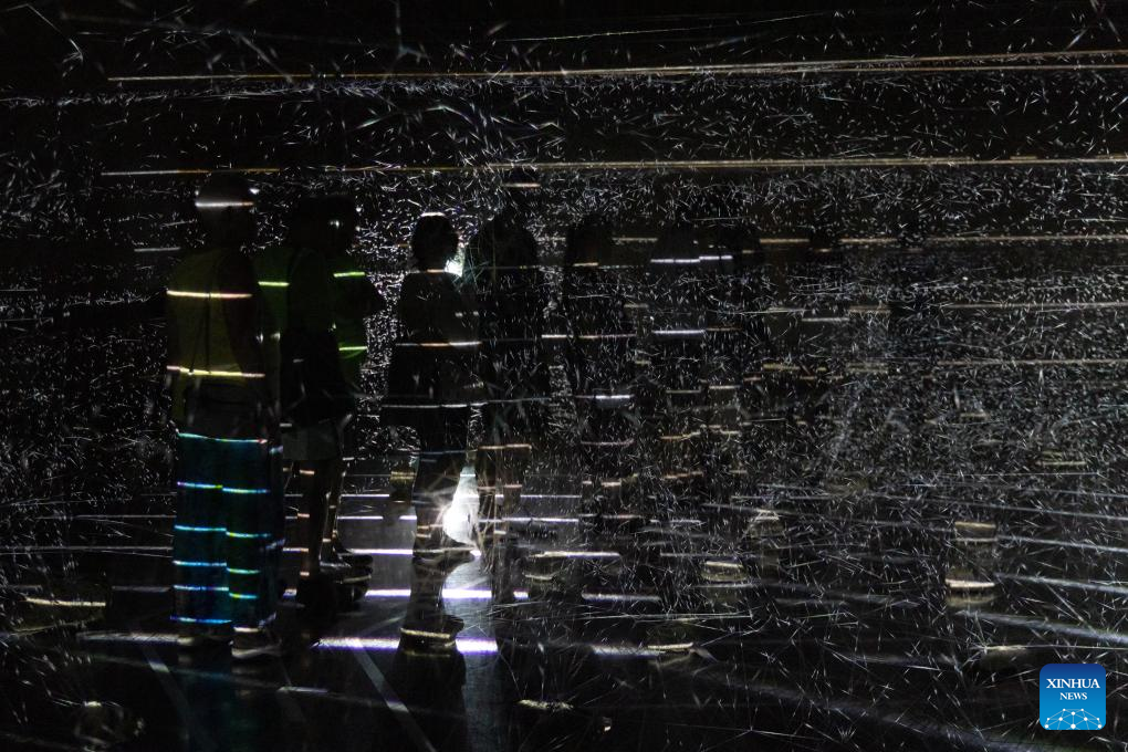 People interact with a light installation during the Zsolnay Light Festival held in downtown Pecs, Hungary on July 4, 2025. (Photo by Attila Volgyi/Xinhua)