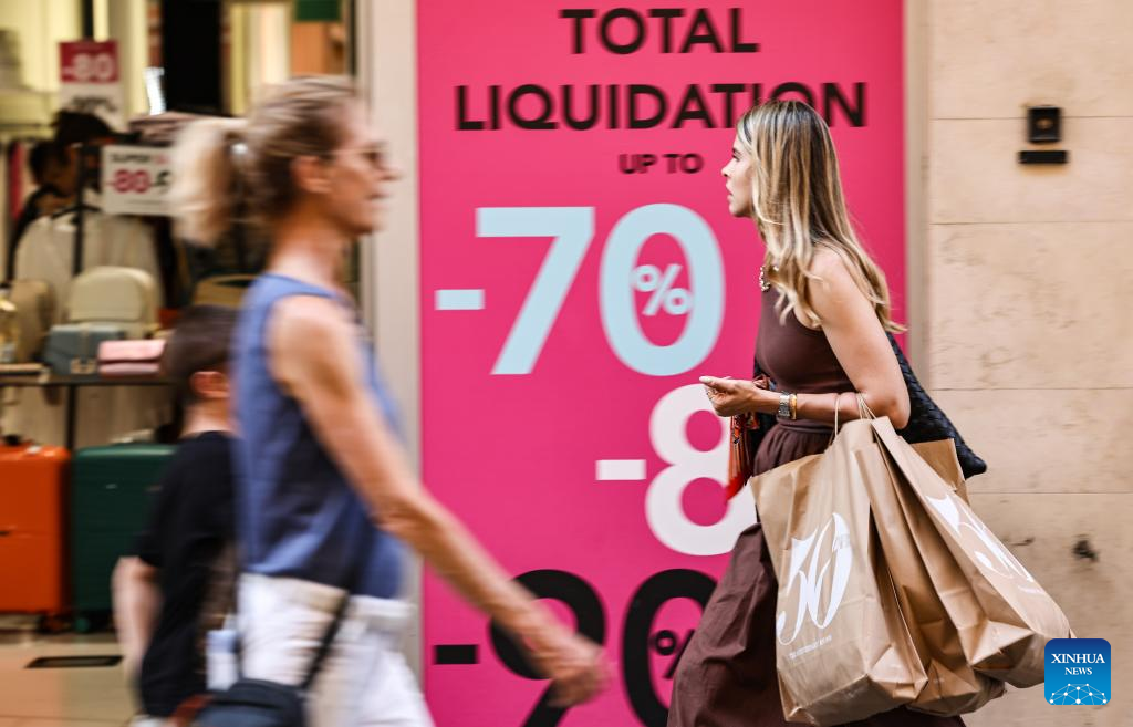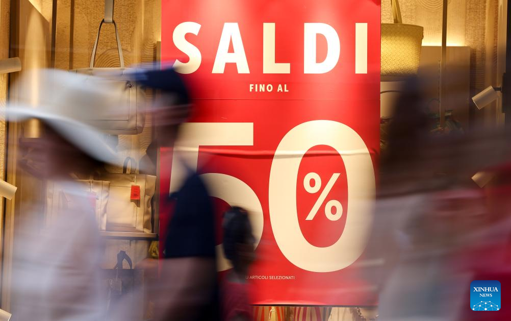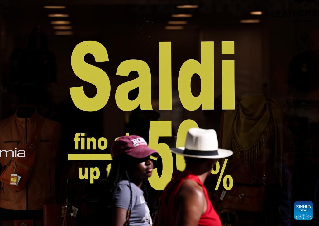 People walk past a shop window in Rome, Italy, July 5, 2025. Italy's summer sales started on Saturday, running between six and eight weeks. (Xinhua/Li Jing)
