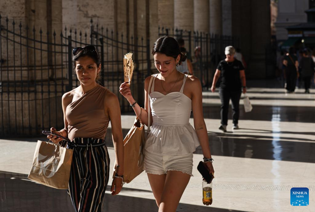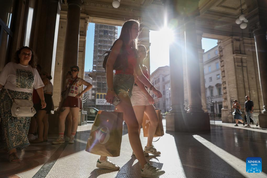 People walk with shopping bags in Rome, Italy, July 5, 2025. Italy's summer sales started on Saturday, running between six and eight weeks. (Xinhua/Li Jing)