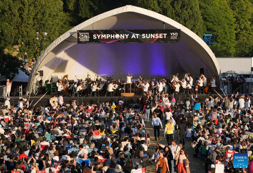 People watch a music performance by the Vancouver Symphony Orchestra during the "Symphony at Sunset" concert at Sunset Beach Park in Vancouver, British Columbia, Canada, July 5, 2025. (Photo by Liang Sen/Xinhua)