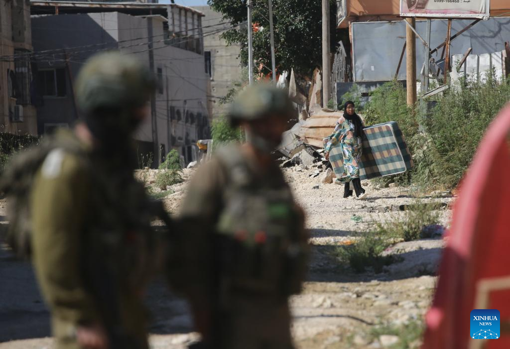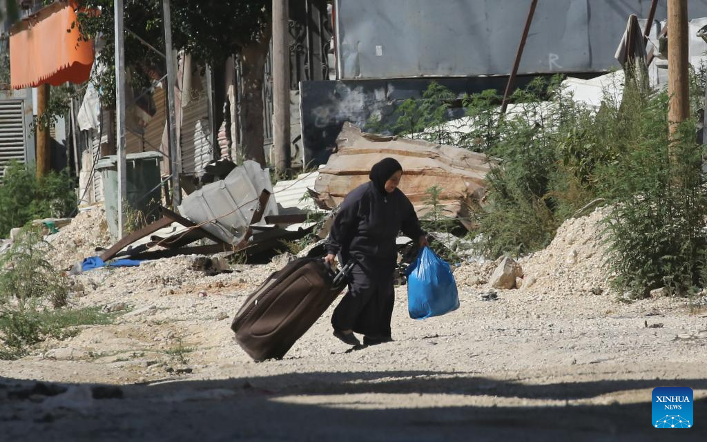 A displaced Palestinian carrying her belongings is seen in Tulkarm refugee camp, northern West Bank, on July 6, 2025. Displaced Palestinians were allowed to return for belongings after the Israeli army announced the demolition of houses here. (Photo by Nidal Eshtayeh/Xinhua)
