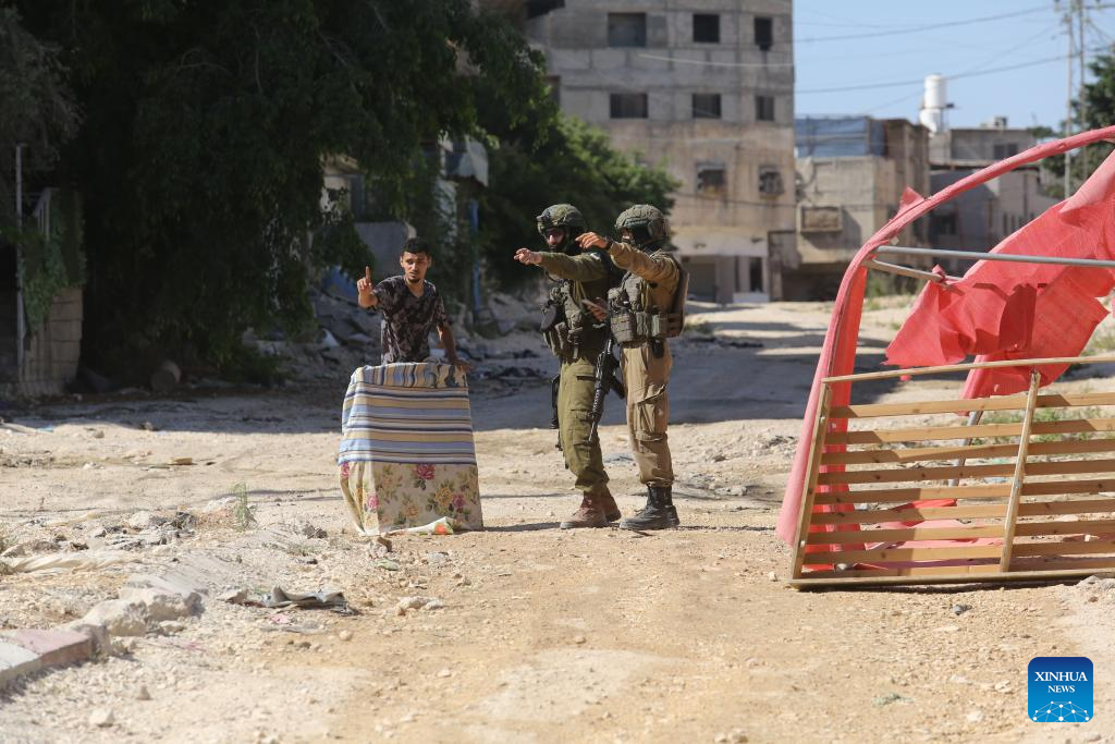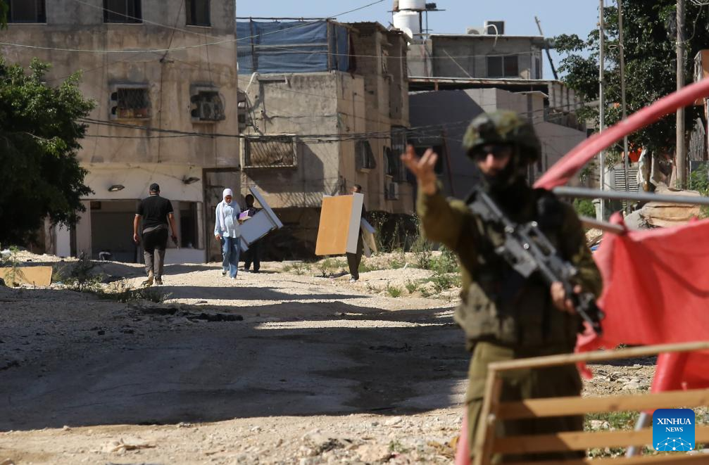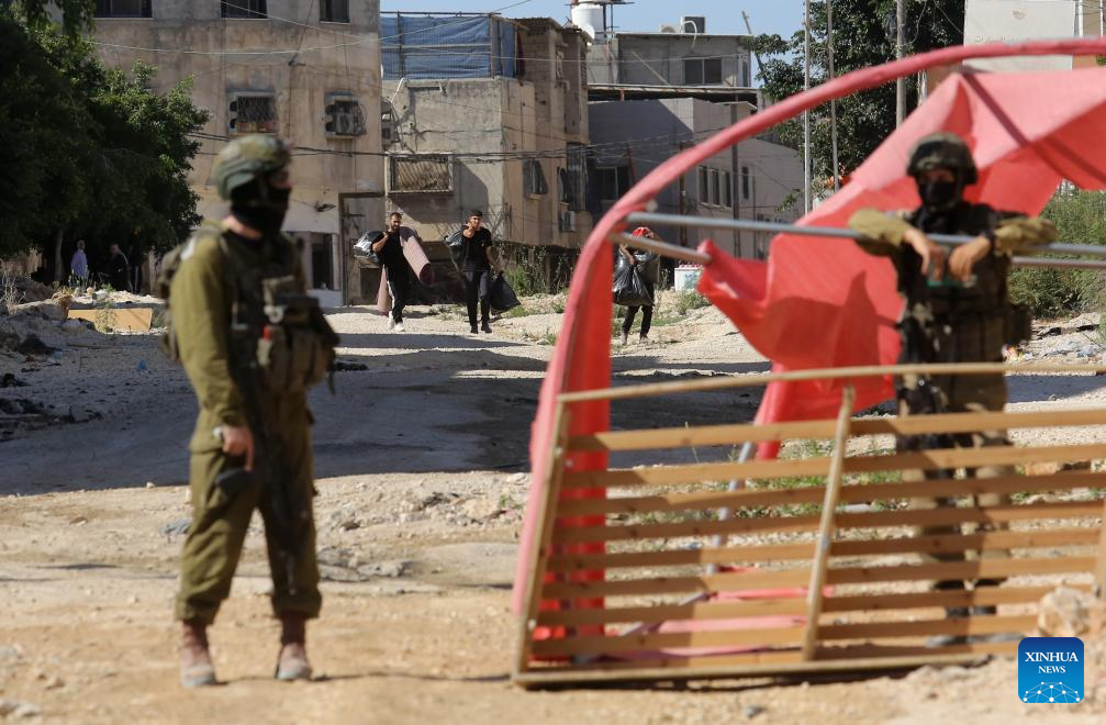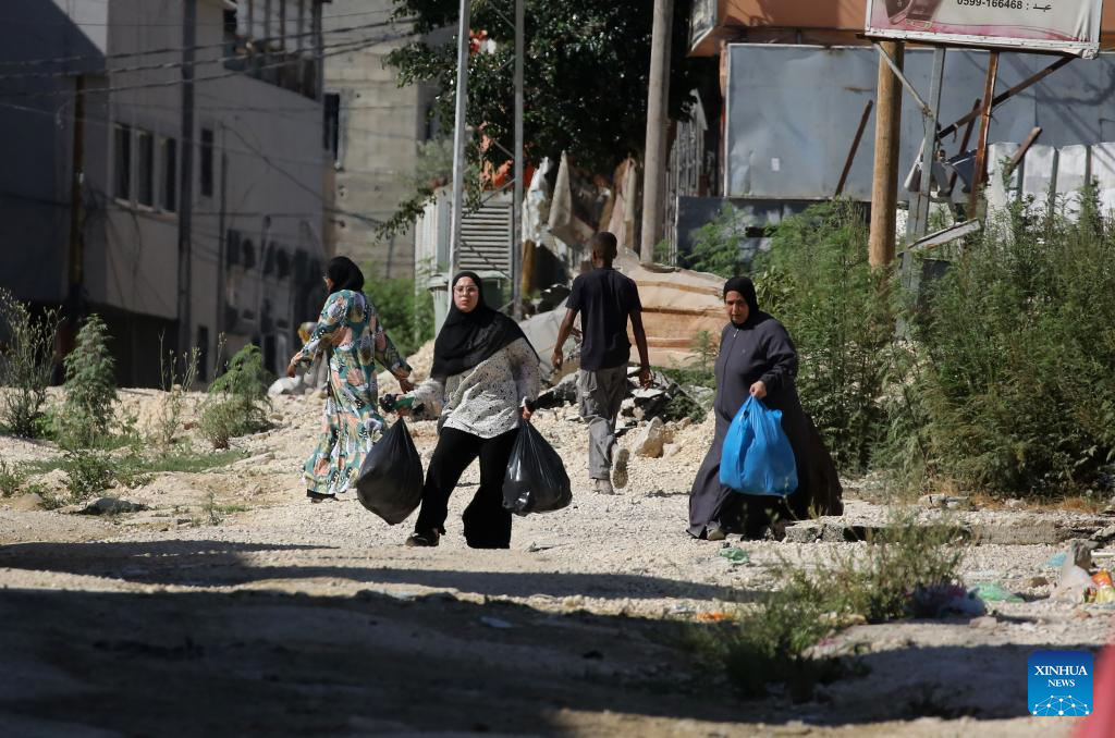 Displaced Palestinians carrying their belongings are seen in Tulkarm refugee camp, northern West Bank, on July 6, 2025. Displaced Palestinians were allowed to return for belongings after the Israeli army announced the demolition of houses here. (Photo by Nidal Eshtayeh/Xinhua)