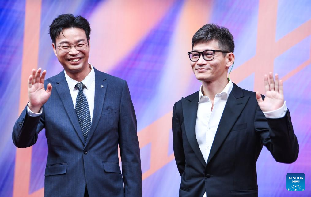 Actors Han Geng (L) and Zheng Kai pose on the red carpet during the closing ceremony of the 2025 SCO (the Shanghai Cooperation Organization) Film Festival in Yongchuan District of southwest China's Chongqing Municipality, July 6, 2025. (Xinhua/Wang Quanchao)