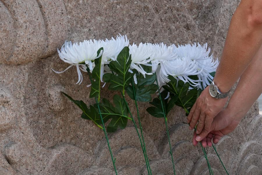 A visitor lays flowers in front of a monument to martyrs at the Nanjing Anti-Japanese Aviation Martyrs Memorial Hall in Nanjing, east China's Jiangsu Province, on July 7, 2025. (Xinhua/Li Bo)