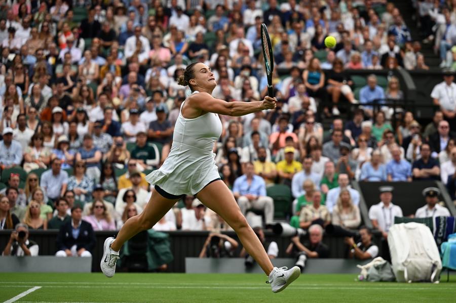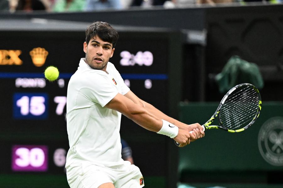 LONDON, July 6 (Xinhua) -- Defending champion Carlos Alcaraz staged a thrilling comeback to defeat Andrey Rublev and advance to the Wimbledon quarterfinals, while women's top seed Aryna Sabalenka continued her dominant run with a straight-sets victory over Elise Mertens on Sunday.