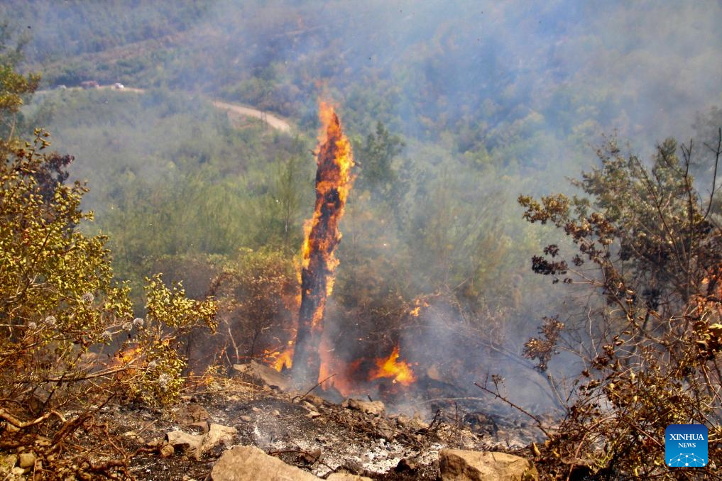 A buring tree is seen amid heavy smoke during a forest fire in the rural area of Latakia province, Syria, July 7, 2025. Syrian authorities established a joint operations room on Sunday to combat wildfires that have ravaged more than 7,000 hectares of forests in the northwestern Latakia province for four consecutive days. (Str/Xinhua)