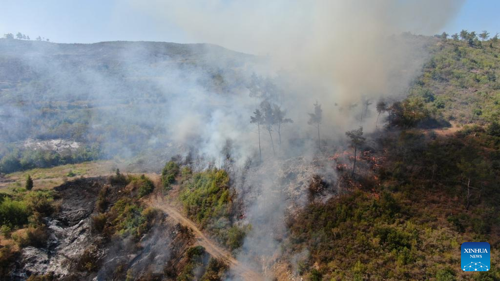 An aerial photo taken on July 7, 2025 shows smoke rising from scorched hillsides after a wildfire ripped through forested areas in Latakia province, Syria. Syrian authorities established a joint operations room on Sunday to combat wildfires that have ravaged more than 7,000 hectares of forests in the northwestern Latakia province for four consecutive days. (Str/Xinhua)