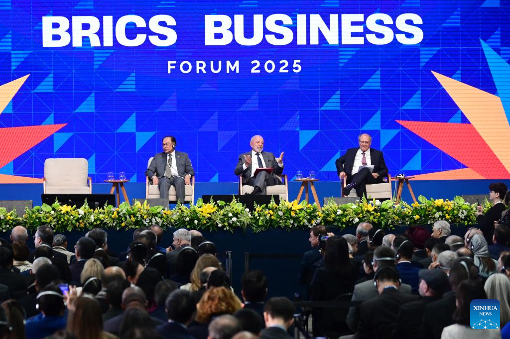 This photo taken on July 5, 2025 shows the opening ceremony of the BRICS Business Forum in Rio de Janeiro, Brazil. (Photo by Lucio Tavora/Xinhua)