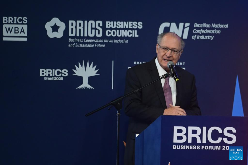 Brazilian Vice President Geraldo Alckmin, also Brazilian minister of development, industry, commerce and services, speaks during the opening ceremony of the BRICS Business Forum in Rio de Janeiro, Brazil, July 5, 2025. (Photo by Lucio Tavora/Xinhua)