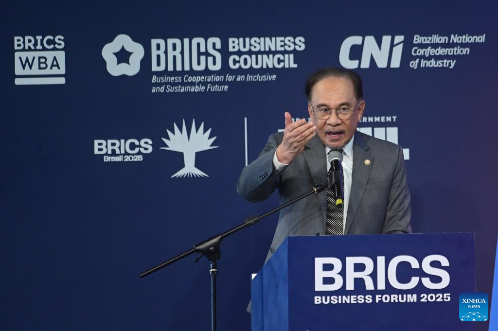 Malaysian Prime Minister Anwar Ibrahim speaks during the opening ceremony of the BRICS Business Forum in Rio de Janeiro, Brazil, July 5, 2025. (Photo by Lucio Tavora/Xinhua)