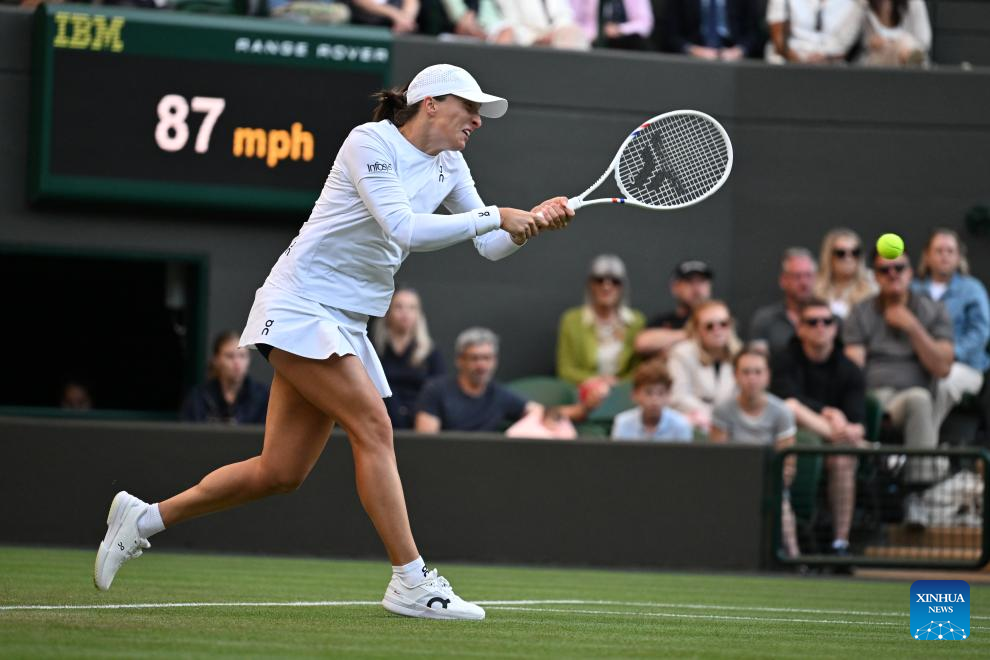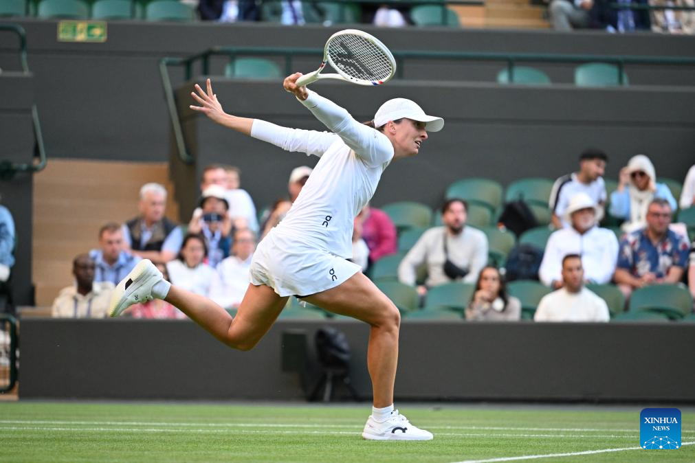 Iga Swiatek hits a return during the women's singles round of 8 match between Iga Swiatek of Poland and Clara Tauson of Denmark at the Wimbledon Tennis Championships in London, Britain, July 7, 2025. (Xinhua/Zhao Dingzhe)