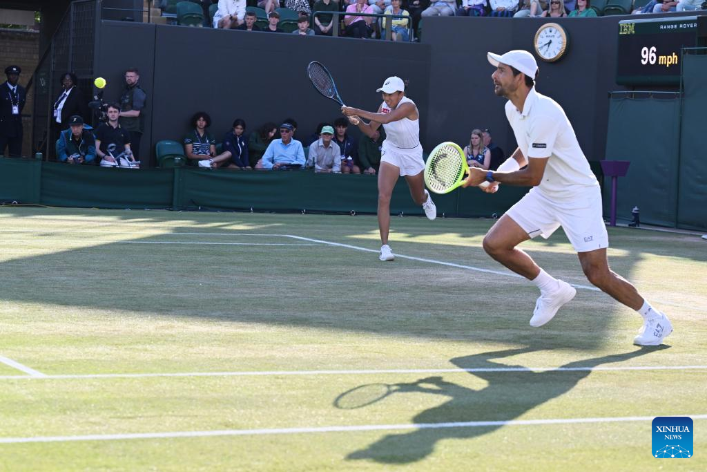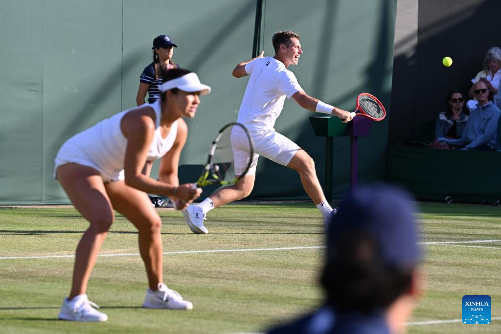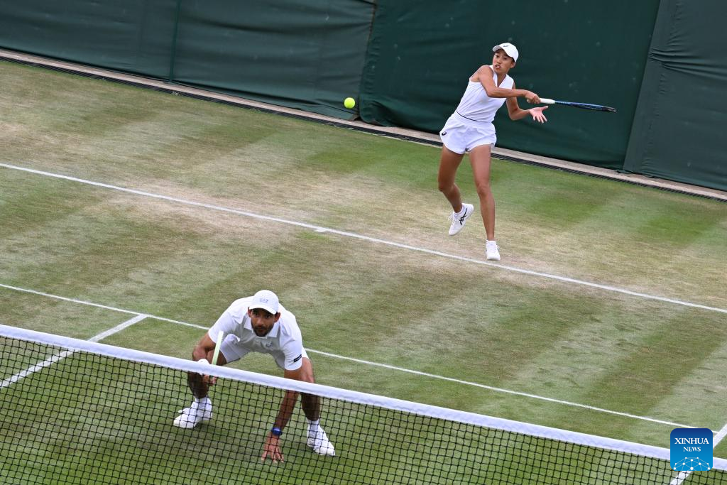 Zhang Shuai (L)/Marcelo Arevalo compete during the mixed doubles quarter final match between Zhang Shuai (China)/Marcelo Arevalo (El Salvador) and Desirae Krawczyk (USA)/Olivia Gadecki (Australia) at the Wimbledon Tennis Championships in London, Britain, July 7, 2025. (Xinhua/Zhao Dingzhe)