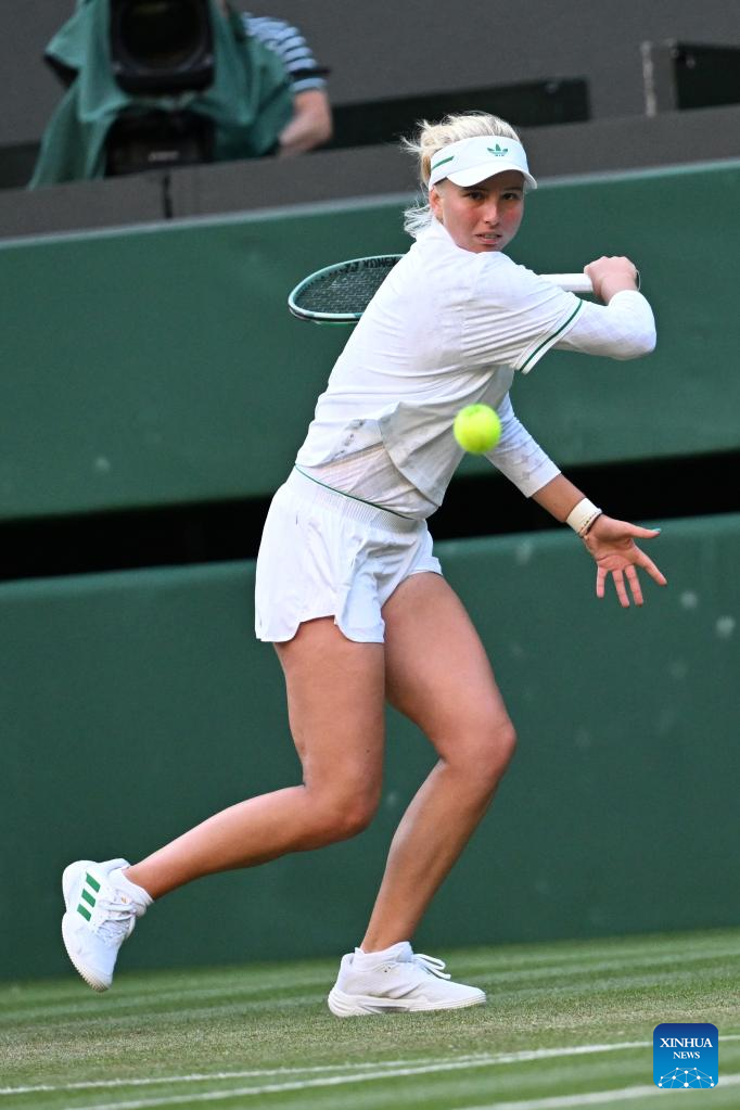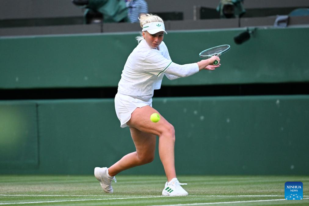 Clara Tauson hits a return during the women's singles round of 8 match between Iga Swiatek of Poland and Clara Tauson of Denmark at the Wimbledon Tennis Championships in London, Britain, July 7, 2025. (Xinhua/Zhao Dingzhe)
