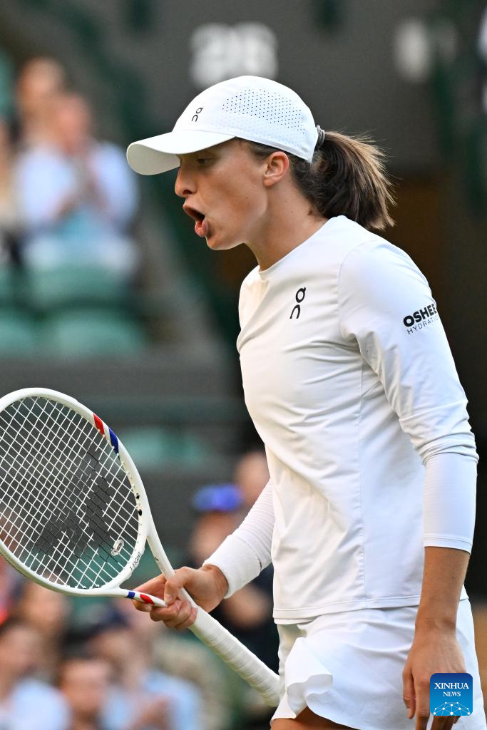 Iga Swiatek reacts during the women's singles round of 8 match between Iga Swiatek of Poland and Clara Tauson of Denmark at the Wimbledon Tennis Championships in London, Britain, July 7, 2025. (Xinhua/Zhao Dingzhe)