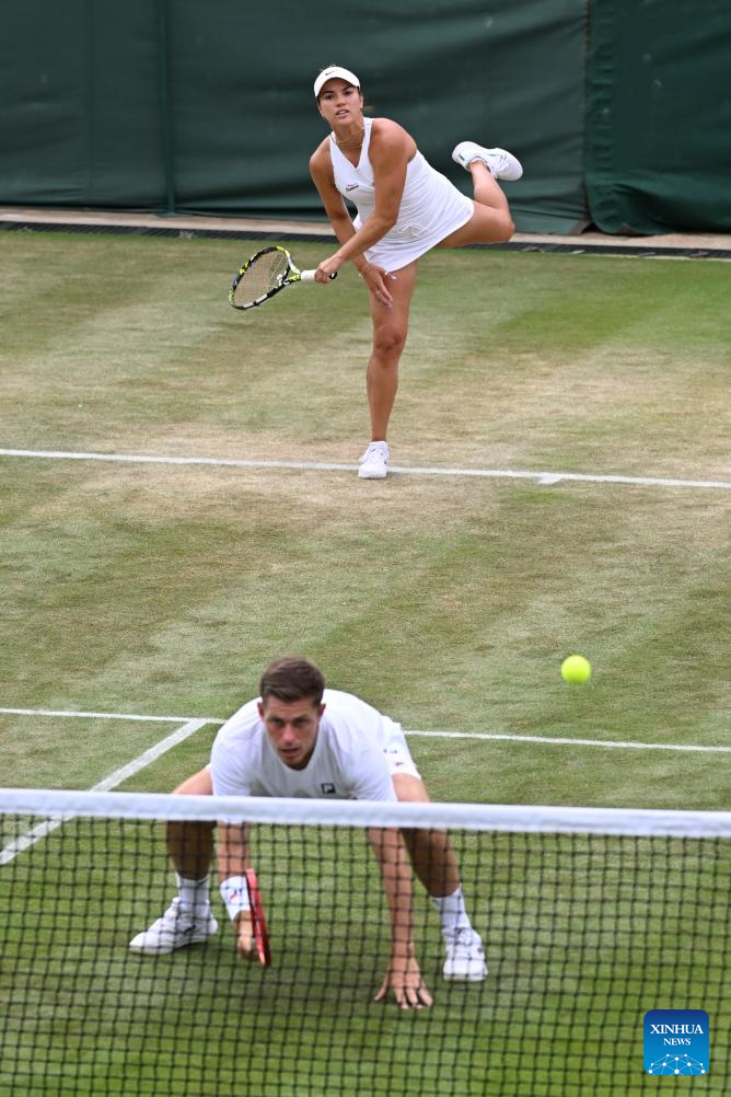 Desirae Krawczyk (up)/Olivia Gadecki compete during the mixed doubles quarter final match between Zhang Shuai (China)/Marcelo Arevalo (El Salvador) and Desirae Krawczyk (USA)/Olivia Gadecki (Australia) at the Wimbledon Tennis Championships in London, Britain, July 7, 2025. (Xinhua/Zhao Dingzhe)