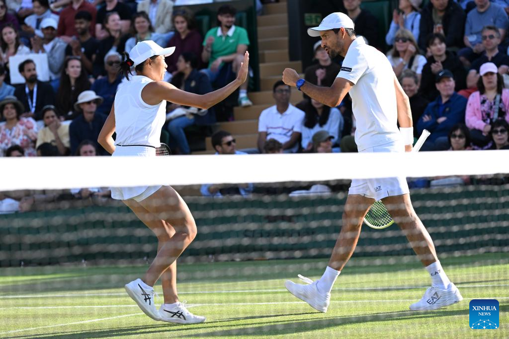 Zhang Shuai (L) celebrates with Marcelo Arevalo during the mixed doubles quarter final match between Zhang Shuai (China)/Marcelo Arevalo (El Salvador) and Desirae Krawczyk (USA)/Olivia Gadecki (Australia) at the Wimbledon Tennis Championships in London, Britain, July 7, 2025. (Xinhua/Zhao Dingzhe)
