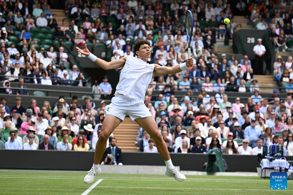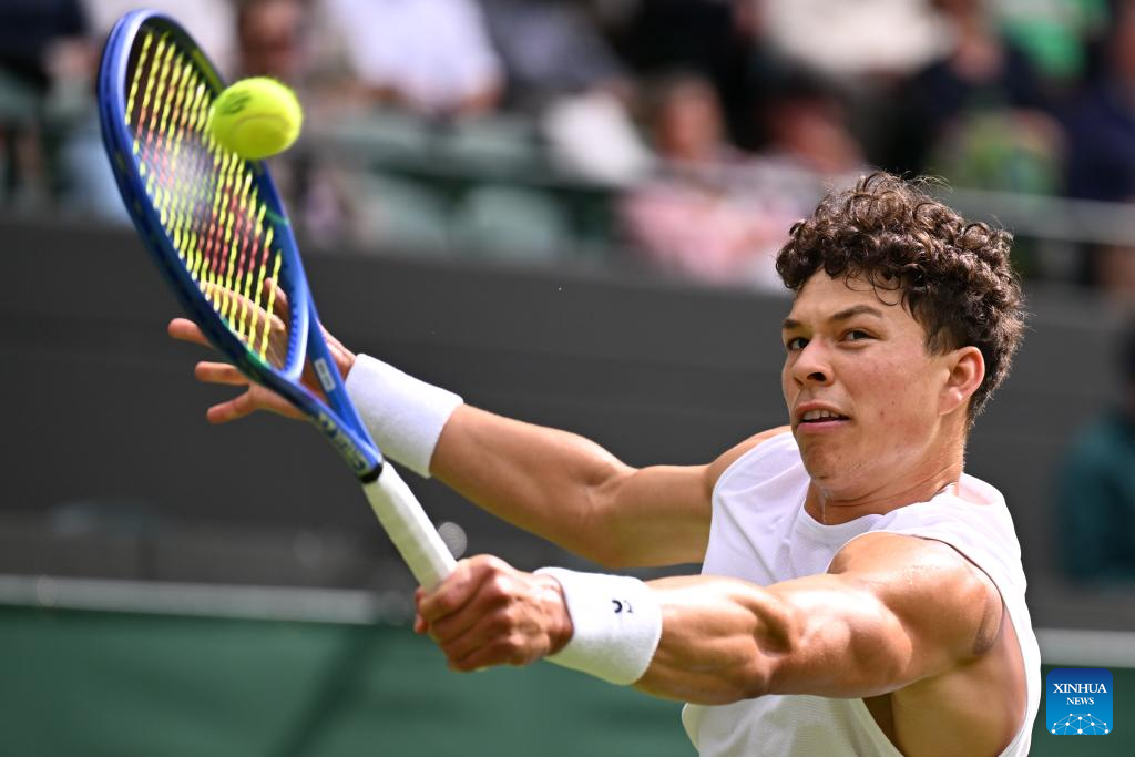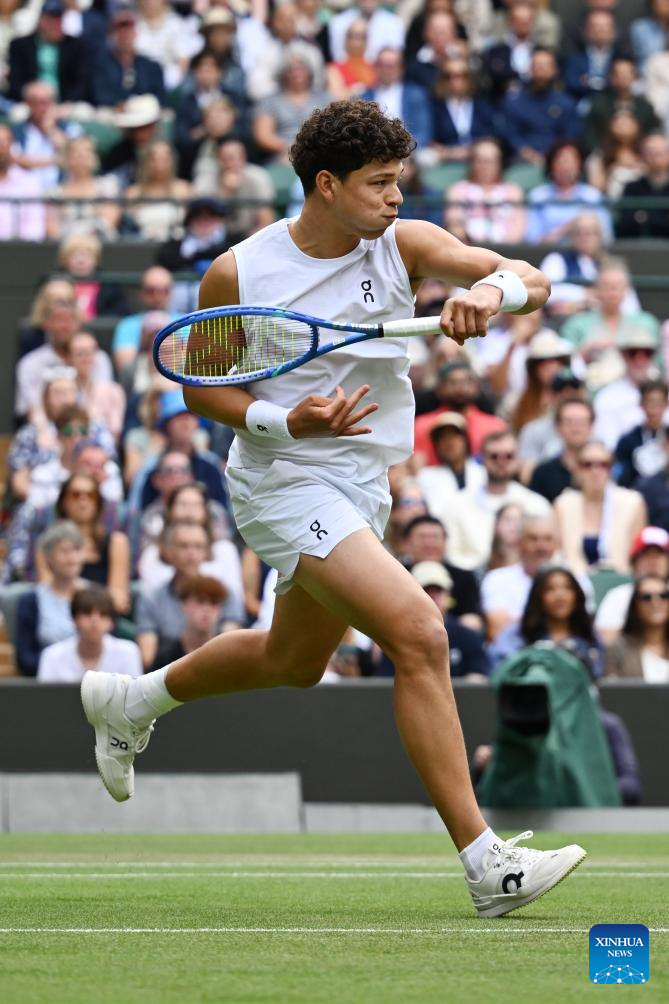 Ben Shelton hits a return during the men's singles round of 16 match between Ben Shelton of the United States and Lorenzo Sonego of Italy at the Wimbledon Tennis Championships in London, Britain, July 7, 2025 (Xinhua/Zhao Dingzhe)