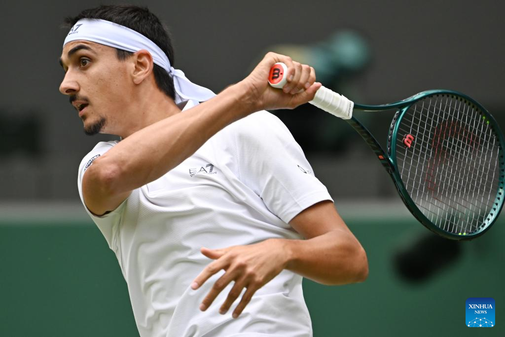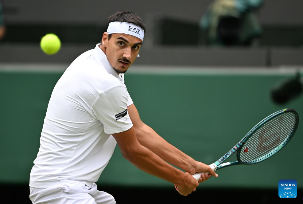 Lorenzo Sonego hits a return during the men's singles round of 16 match between Ben Shelton of the United States and Lorenzo Sonego of Italy at the Wimbledon Tennis Championships in London, Britain, July 7, 2025 (Xinhua/Zhao Dingzhe)