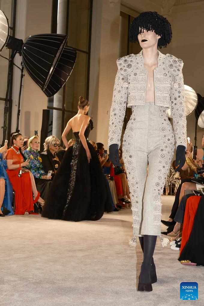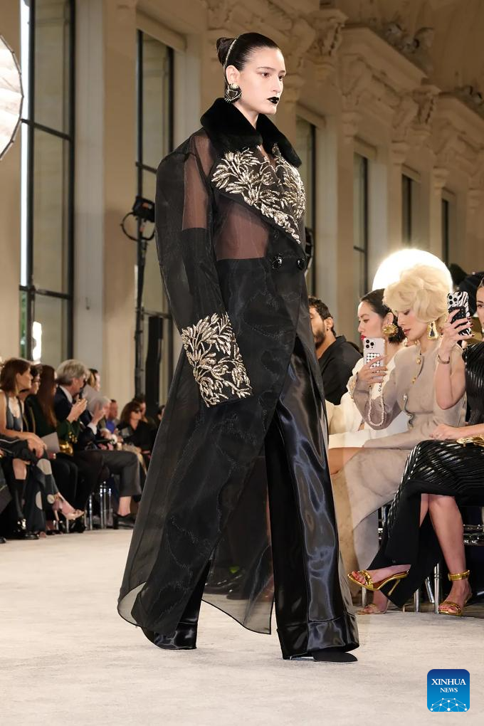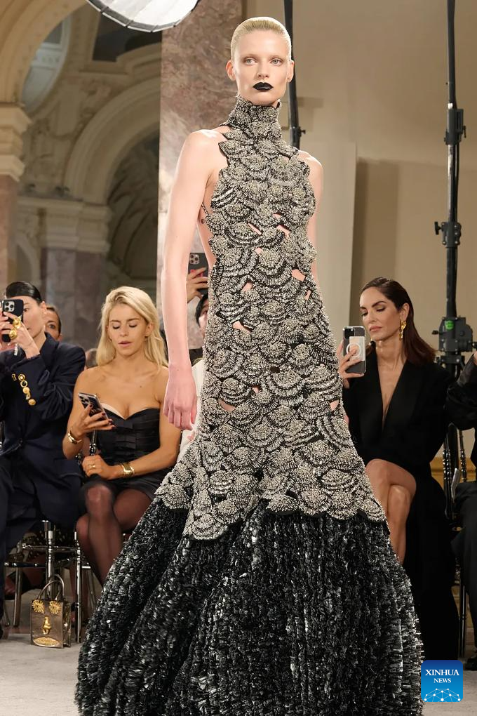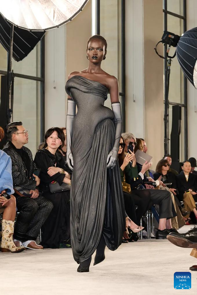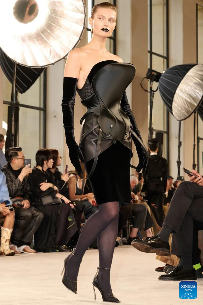 A model presents a creation by Schiaparelli during the Haute Couture Fall/Winter 2025-2026 fashion show in Paris, France, July 7, 2025. (MeetEurope/Handout via Xinhua)