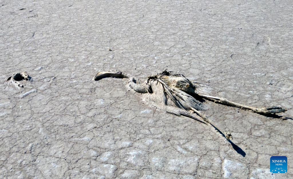 A dead flamingo is seen at Lake Tuz in Ankara, Türkiye, on July 6, 2025. Around 2,000 flamingo chicks have died at Lake Tuz, Türkiye's second-largest lake, during this year's breeding season, triggering alarm over escalating water scarcity and environmental concerns in central Anatolia. (Mustafa Kaya/Handout via Xinhua)