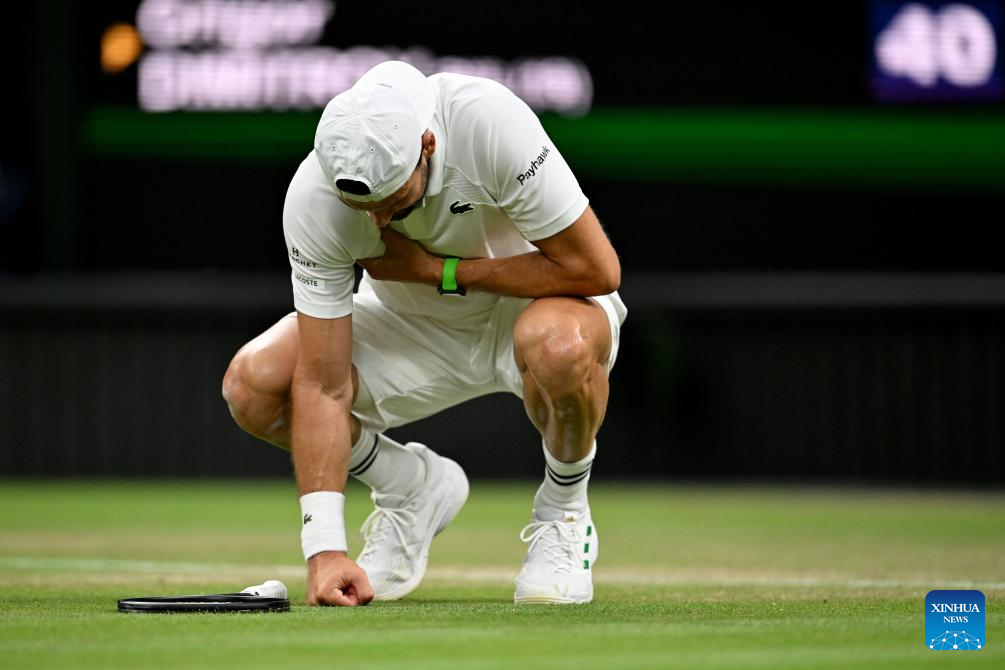 Grigor Dimitrov reacts after getting injured during the men's singles round of 16 match between Grigor Dimitrov of Bulgaria and Jannik Sinner of Italy at the Wimbledon Tennis Championships in London, Britain, July 7, 2025. (Xinhua/Li Ying)