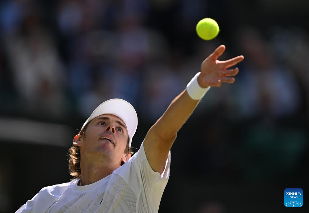 Alex de Minaur serves during the men's singles fourth round match between Novak Djokovic of Serbia and Alex de Minaur of Australia at the Wimbledon Tennis Championships in London, Britain, July 7, 2025. (Xinhua/Li Ying)
