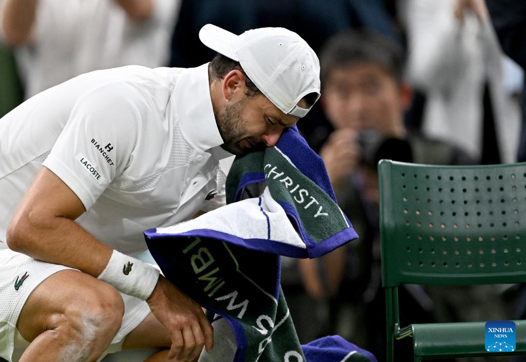 Grigor Dimitrov wipes the tears after getting injured during the men's singles round of 16 match between Grigor Dimitrov of Bulgaria and Jannik Sinner of Italy at the Wimbledon Tennis Championships in London, Britain, July 7, 2025. (Xinhua/Li Ying)
