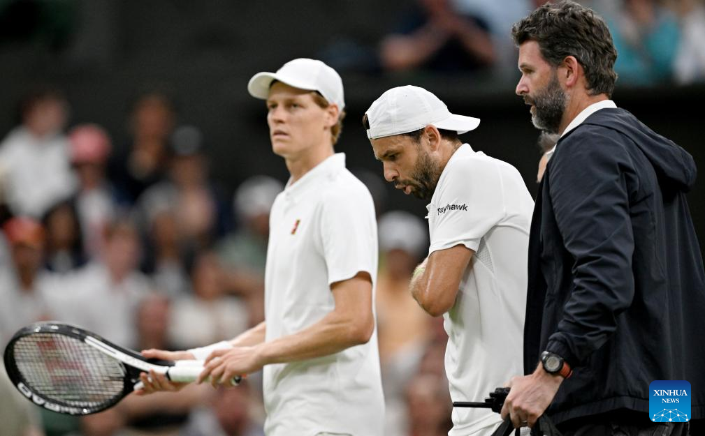 LONDON, July 7 (Xinhua) -- Men's top seed Jannik Sinner advanced to the Wimbledon quarterfinals under unfortunate circumstances on Monday after Grigor Dimitrov was forced to retire due to right pectoral injury while leading their fourth-round clash by two sets.