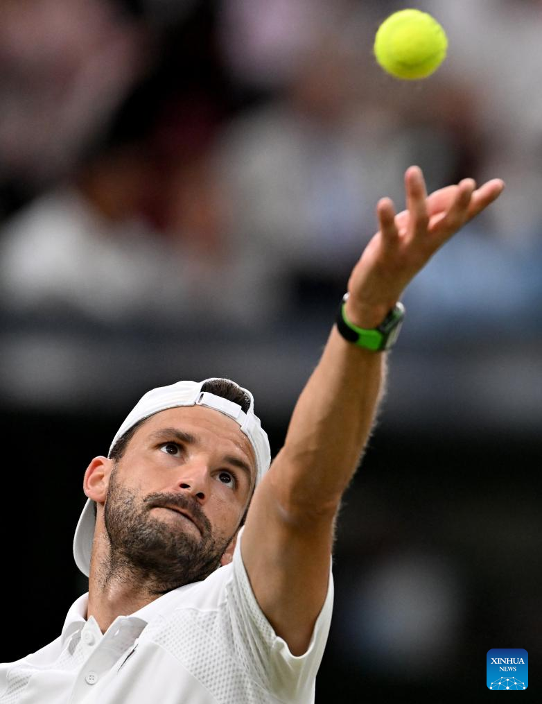 Grigor Dimitrov serves during the men's singles round of 16 match between Grigor Dimitrov of Bulgaria and Jannik Sinner of Italy at the Wimbledon Tennis Championships in London, Britain, July 7, 2025. (Xinhua/Li Ying)