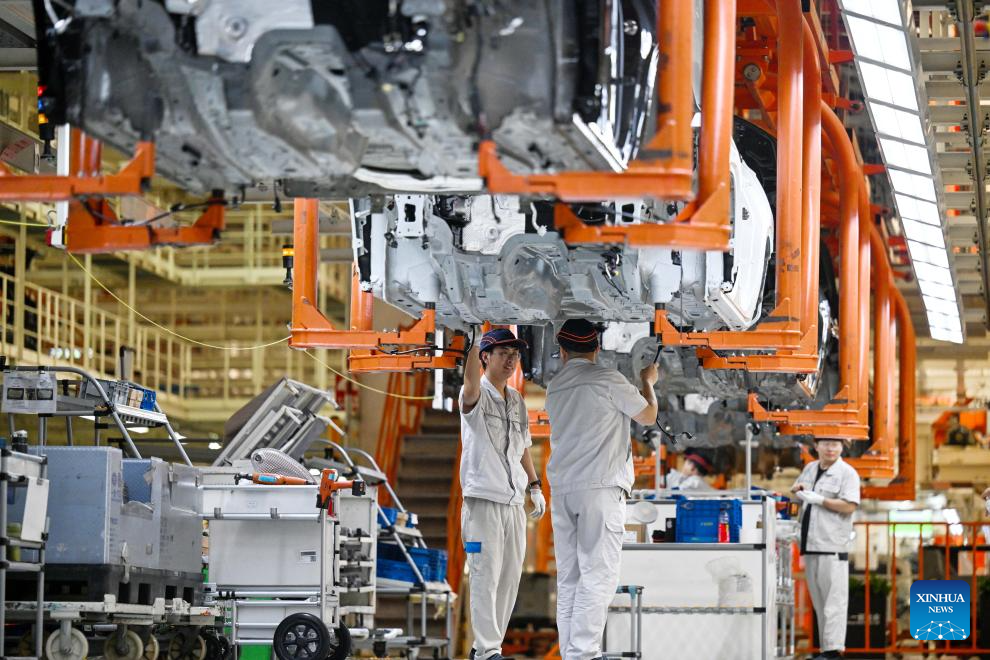 Staff members operate at an assembly line of the north China base of FAW-Volkswagen in north China's Tianjin, July 7, 2025. (Xinhua/Zhao Zishuo)