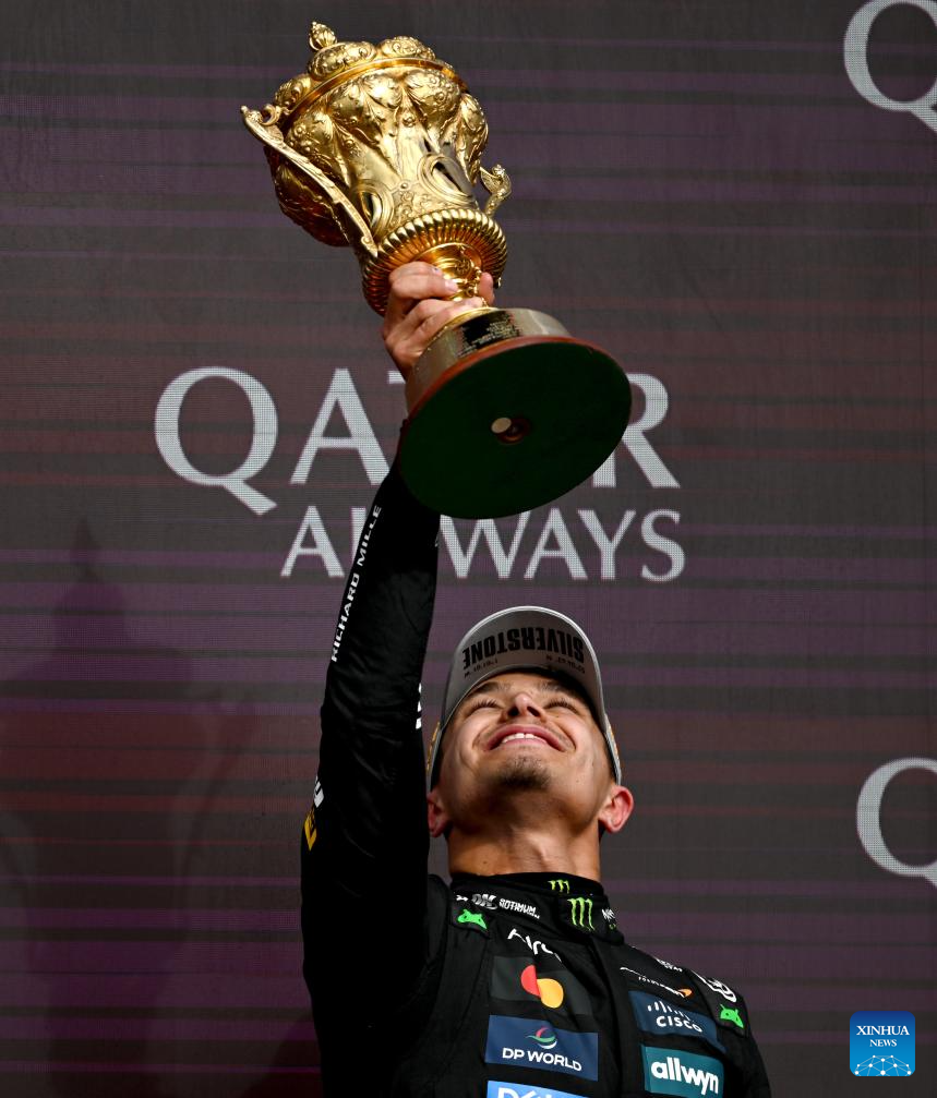 McLaren's British driver Lando Norris celebrates with his trophy during the awarding ceremony after the Formula One British Grand Prix 2025 at the Silverstone Circuit in London, Britain, July 6, 2025. (Xinhua/Li Ying)