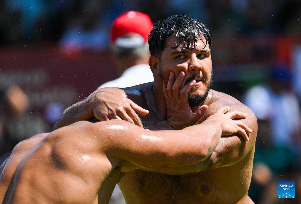 Wrestlers compete at the 664th Oil Wrestling Competition in Edirne, Türkiye, on July 5, 2025. This unique wrestling has a history of hundreds of years. The contestants are shirtless, wearing only special leather pants, smearing olive oil all over their bodies, and competing on the slippery field. The main way to win is to press the opponent's back to the ground or tear his leather pants. (Xinhua/Liu Lei)