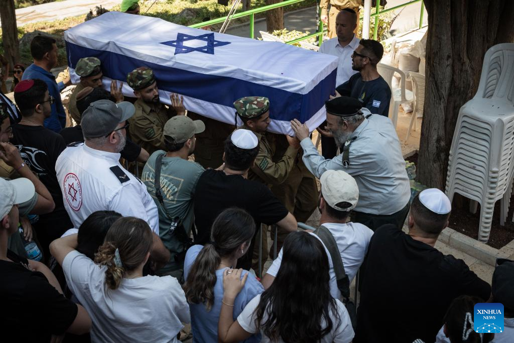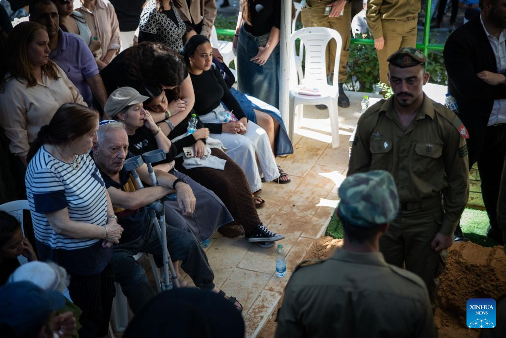 People attend a funeral of an Israeli soldier killed in the Gaza Strip at the Mount Herzl Military Cemetery in Jerusalem, on July 8, 2025. Five Israeli soldiers were killed and 14 others injured in an explosion in the northern Gaza Strip, the Israeli military said on Tuesday. (Xinhua/Chen Junqing)