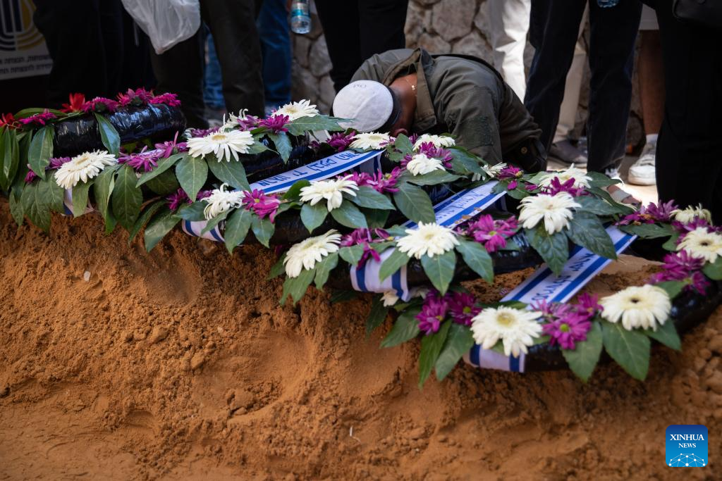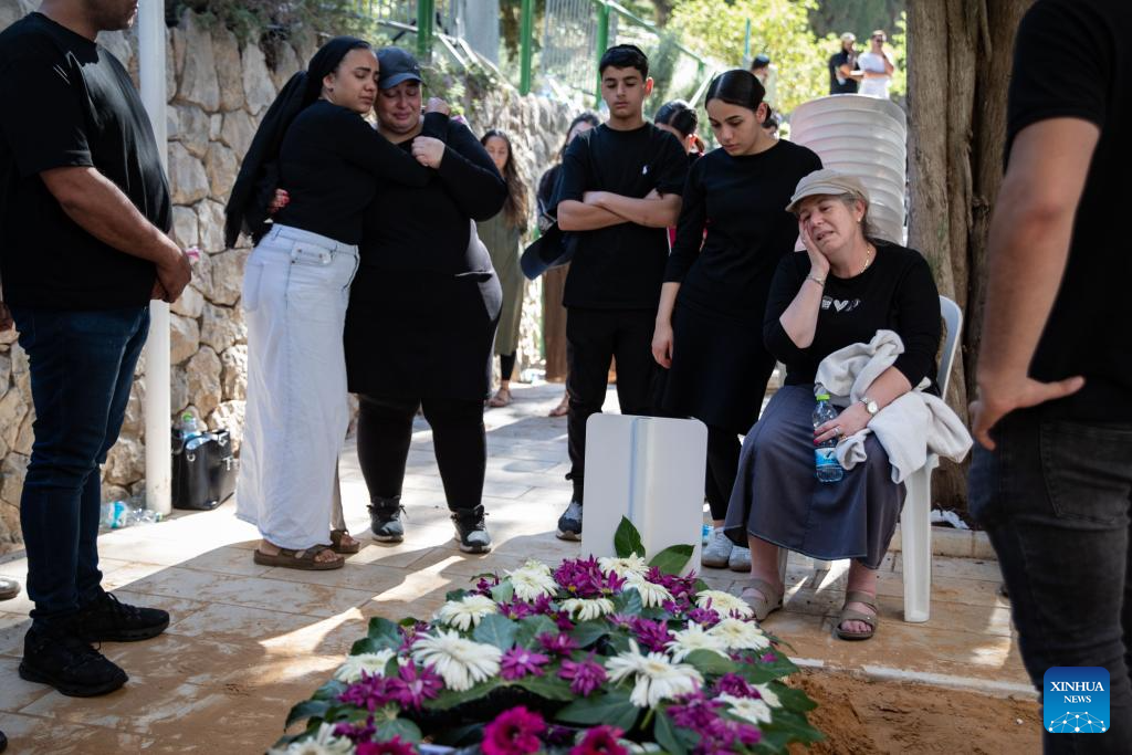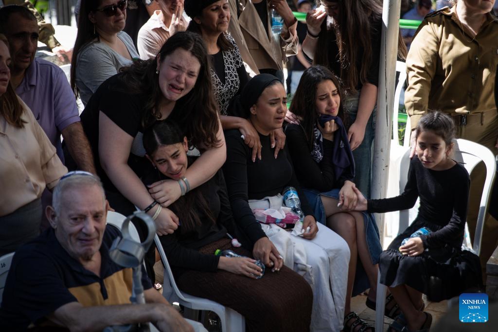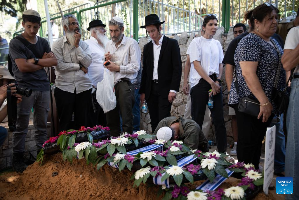 People mourn an Israeli soldier killed in the Gaza Strip at the Mount Herzl Military Cemetery in Jerusalem, on July 8, 2025. Five Israeli soldiers were killed and 14 others injured in an explosion in the northern Gaza Strip, the Israeli military said on Tuesday. (Xinhua/Chen Junqing)