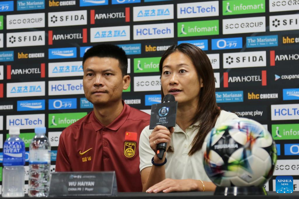 Captain of the Chinese national women's football team Wu Haiyan (R) speaks during a press conference one day before the women's football match between China and South Korea at the EAFF (East Asian Football Federation) E-1 Football Championship 2025 Final in Yongin, South Korea, July 8, 2025. (Xinhua/Huang Xinxin)
