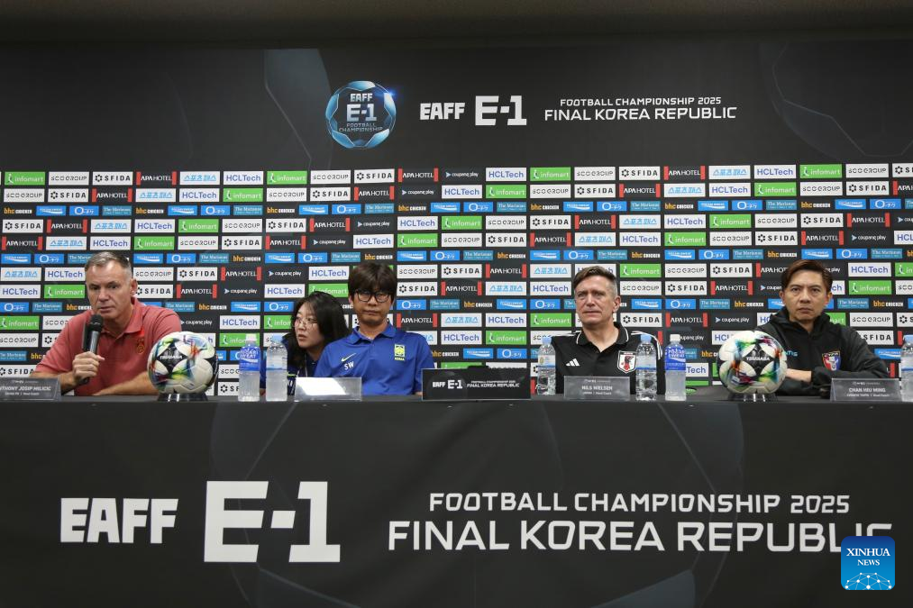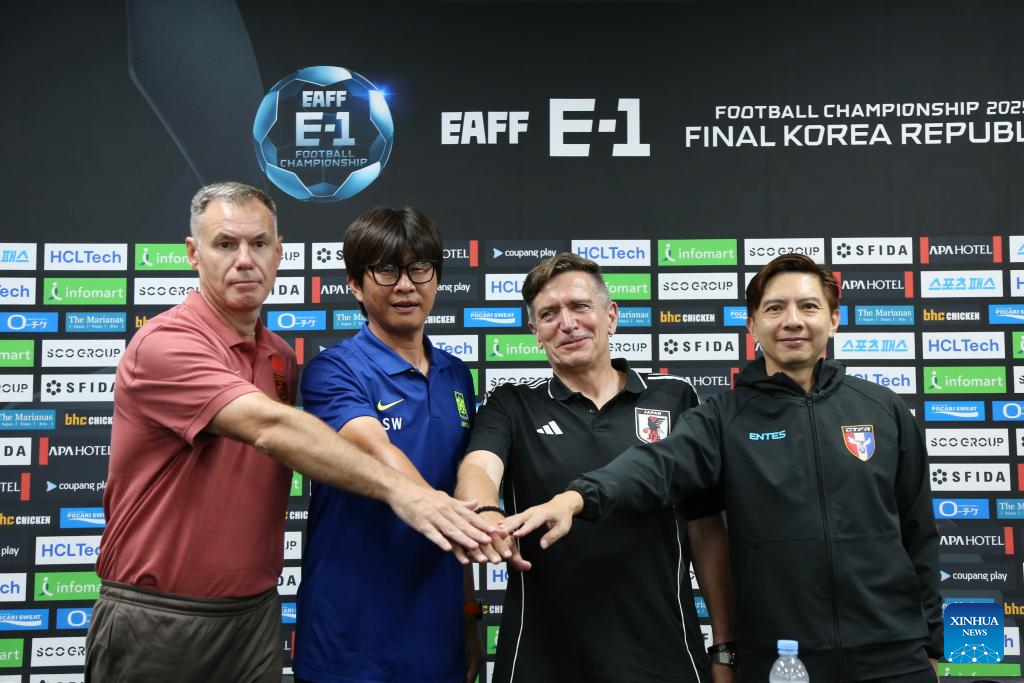 Head coach of Team China Ante Milicic, head coach of Team South Korea Shin Sang-Woo, head coach of Team Japan Nils Nielsen and head coach of Team Chinese Taipei Chan Hiu-Ming (from L to R, front) attend a press conference one day before the women's football match between China and South Korea at the EAFF (East Asian Football Federation) E-1 Football Championship 2025 Final in Yongin, South Korea, July 8, 2025. (Xinhua/Huang Xinxin)