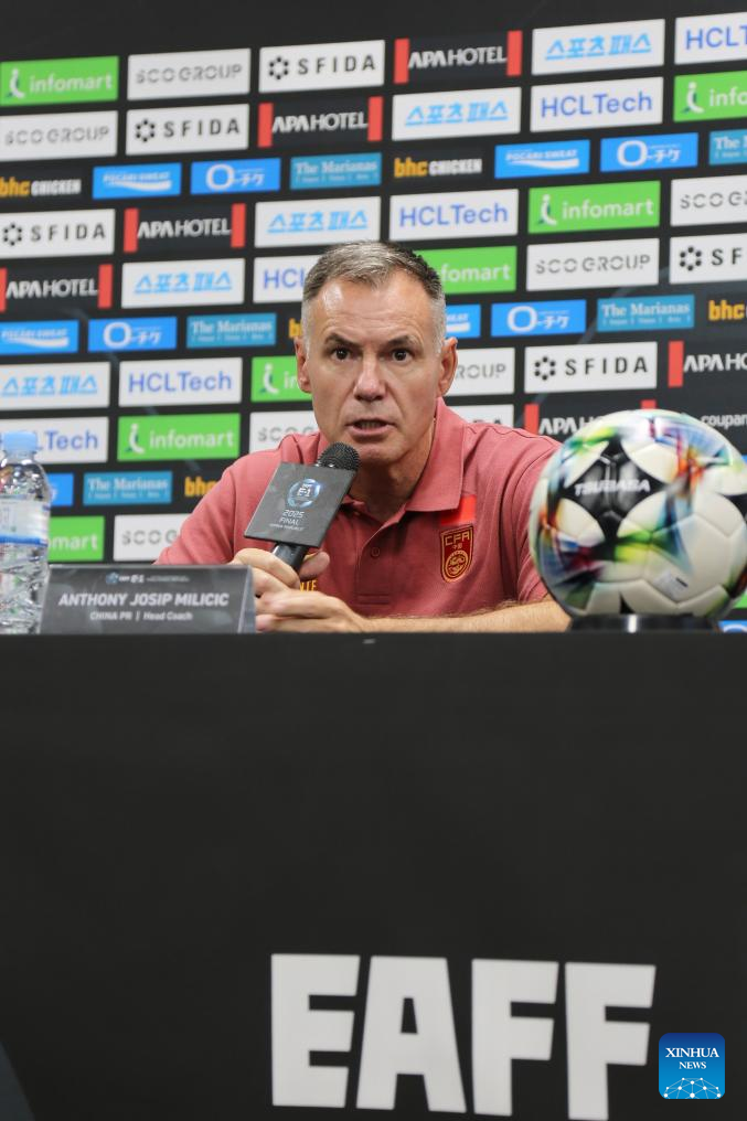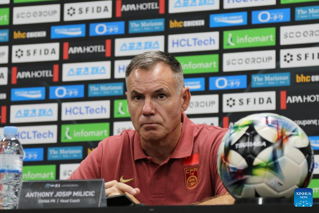 Head coach of the Chinese national women's football team Ante Milicic speaks during a press conference one day before the women's football match between China and South Korea at the EAFF (East Asian Football Federation) E-1 Football Championship 2025 Final in Yongin, South Korea, July 8, 2025. (Xinhua/Huang Xinxin)