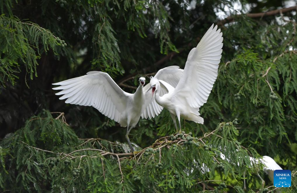 Egrets rest in Dianchi Haihong wetland park in Kunming, capital of southwest China's Yunnan Province, July 7, 2025. The abundant fish and shrimp in Dianchi Haihong wetland park attract a large number of egrets, herons and other birds during summer. (Xinhua/Chen Xinbo)