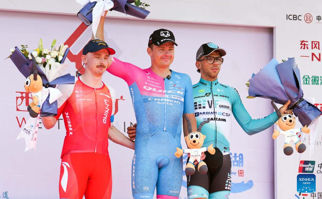 First placed Martin Laas (C) of Quick Pro Team, second placed Alexander Salby of Li Ning Star (L) and third placed Enrico Zanoncello of VF Group Bardiani CSF-Faizane celebrate on the podium after Stage 4 of the Tour of Magnificent Qinghai International Road Cycling Race from Menyuan to Qilian, northwest China's Qinghai Province, July 9, 2025. (Xinhua/Qi Zhiyue)