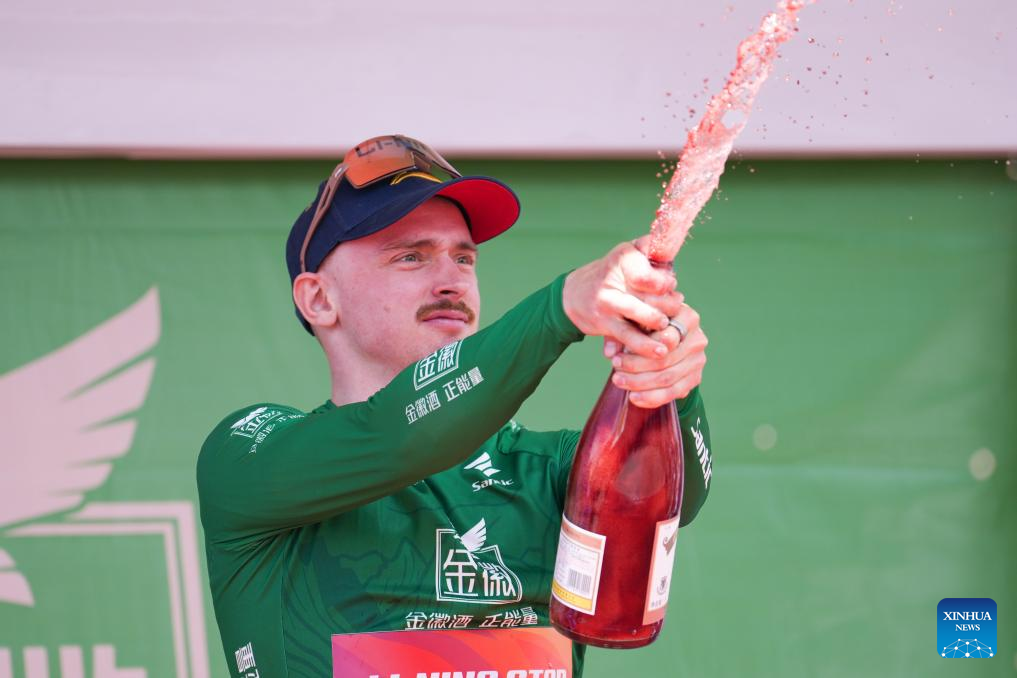 Alexander Salby of Li Ning Star celebrates in the green jersey on the podium after Stage 4 of the Tour of Magnificent Qinghai International Road Cycling Race from Menyuan to Qilian, northwest China's Qinghai Province, July 9, 2025. (Xinhua/Qi Zhiyue)
